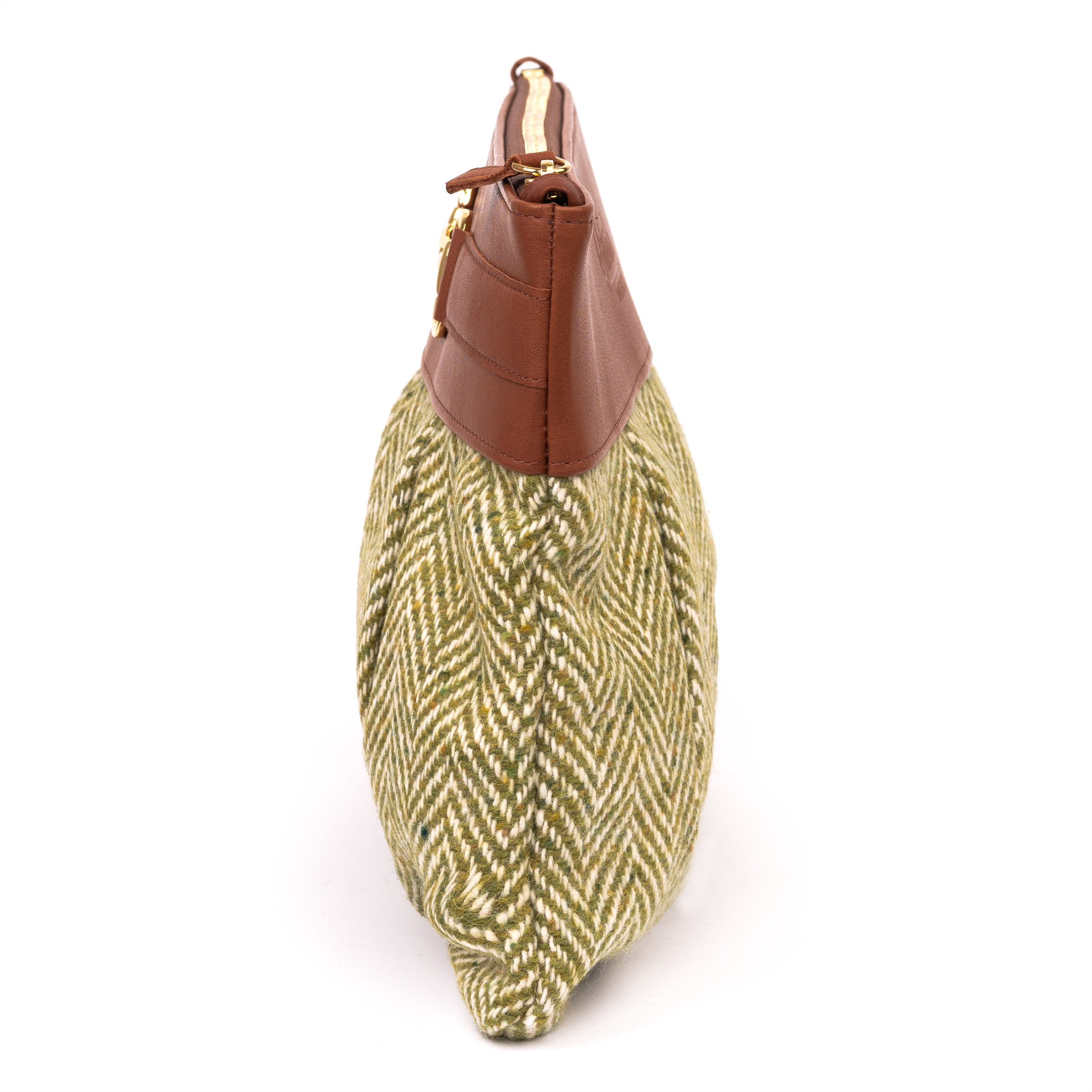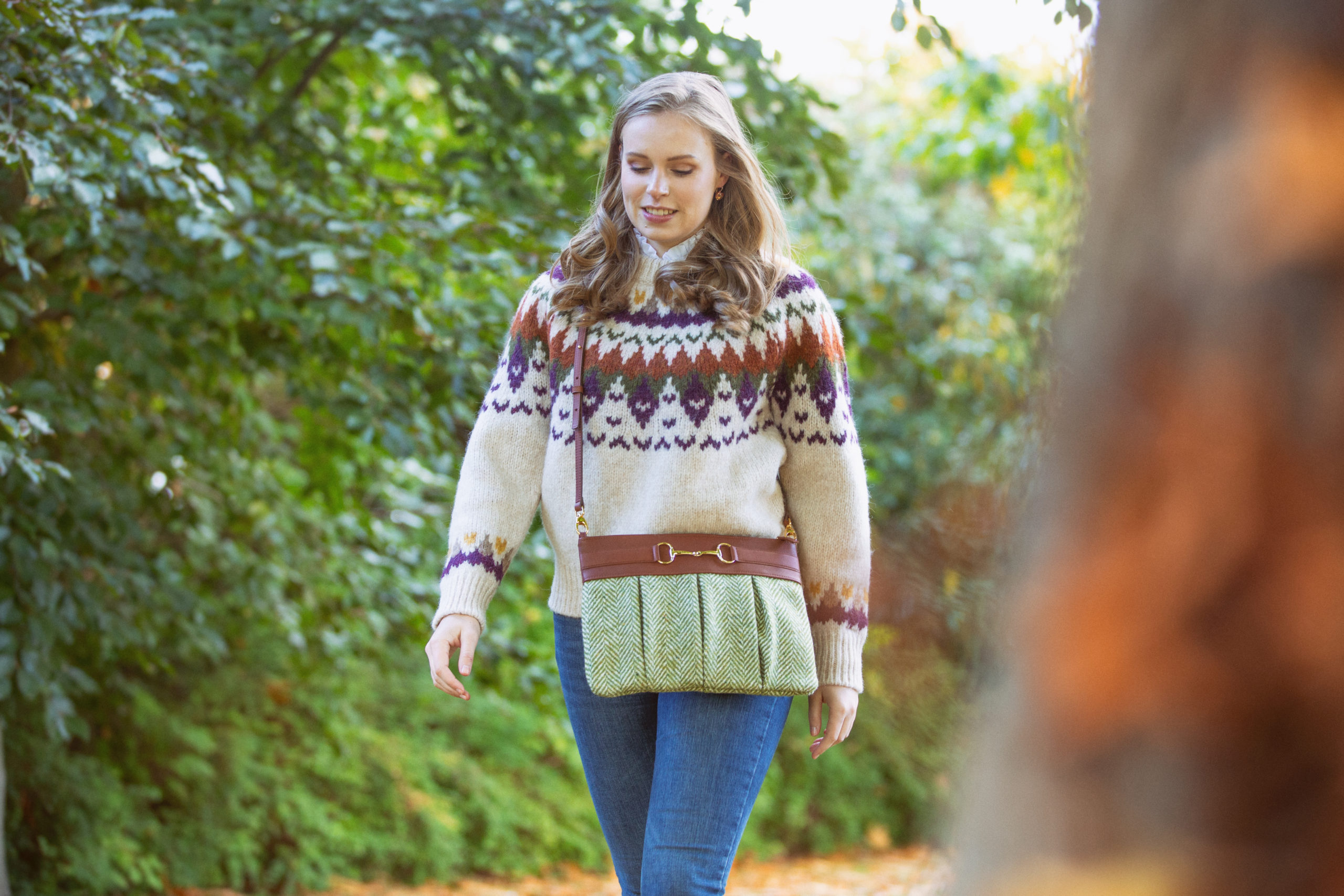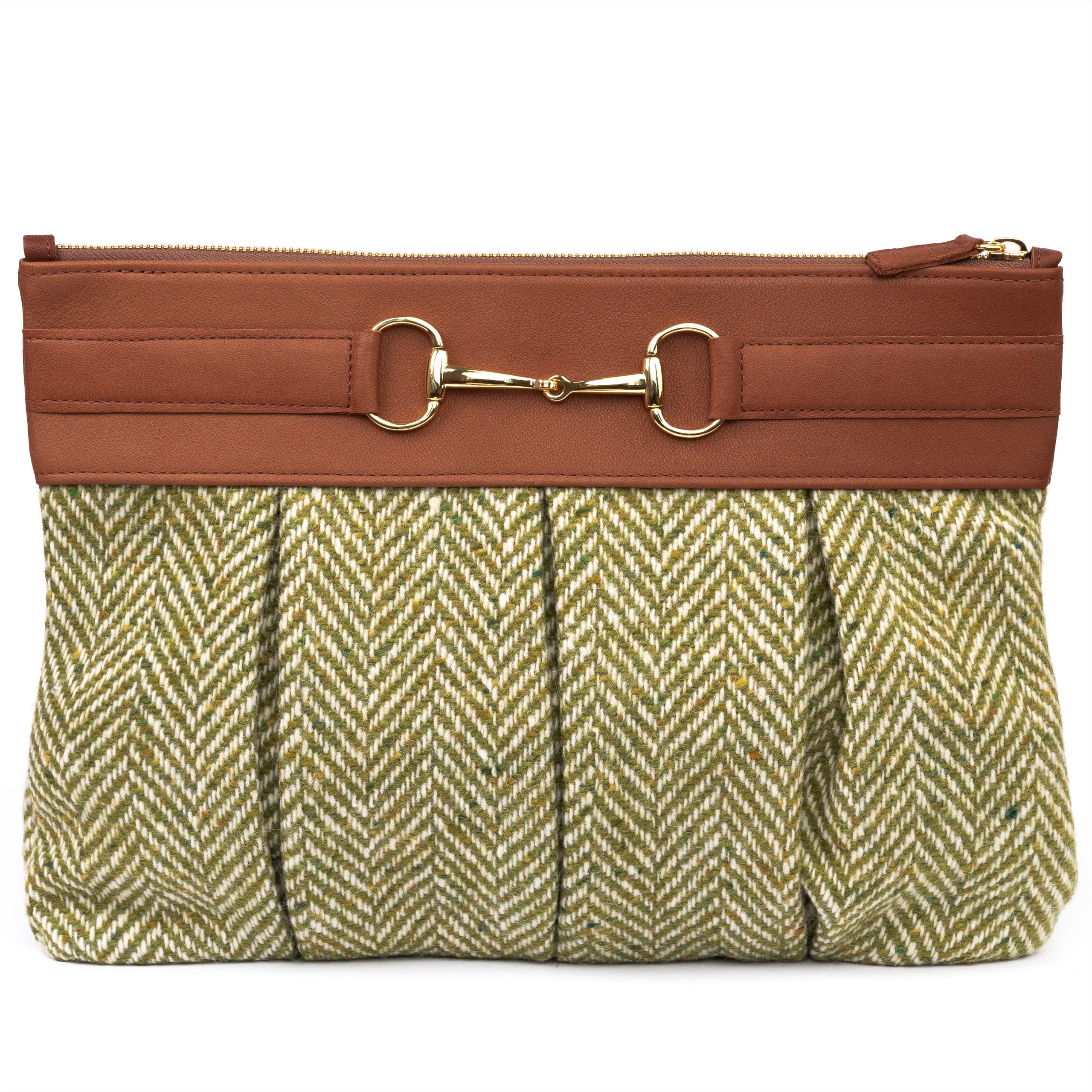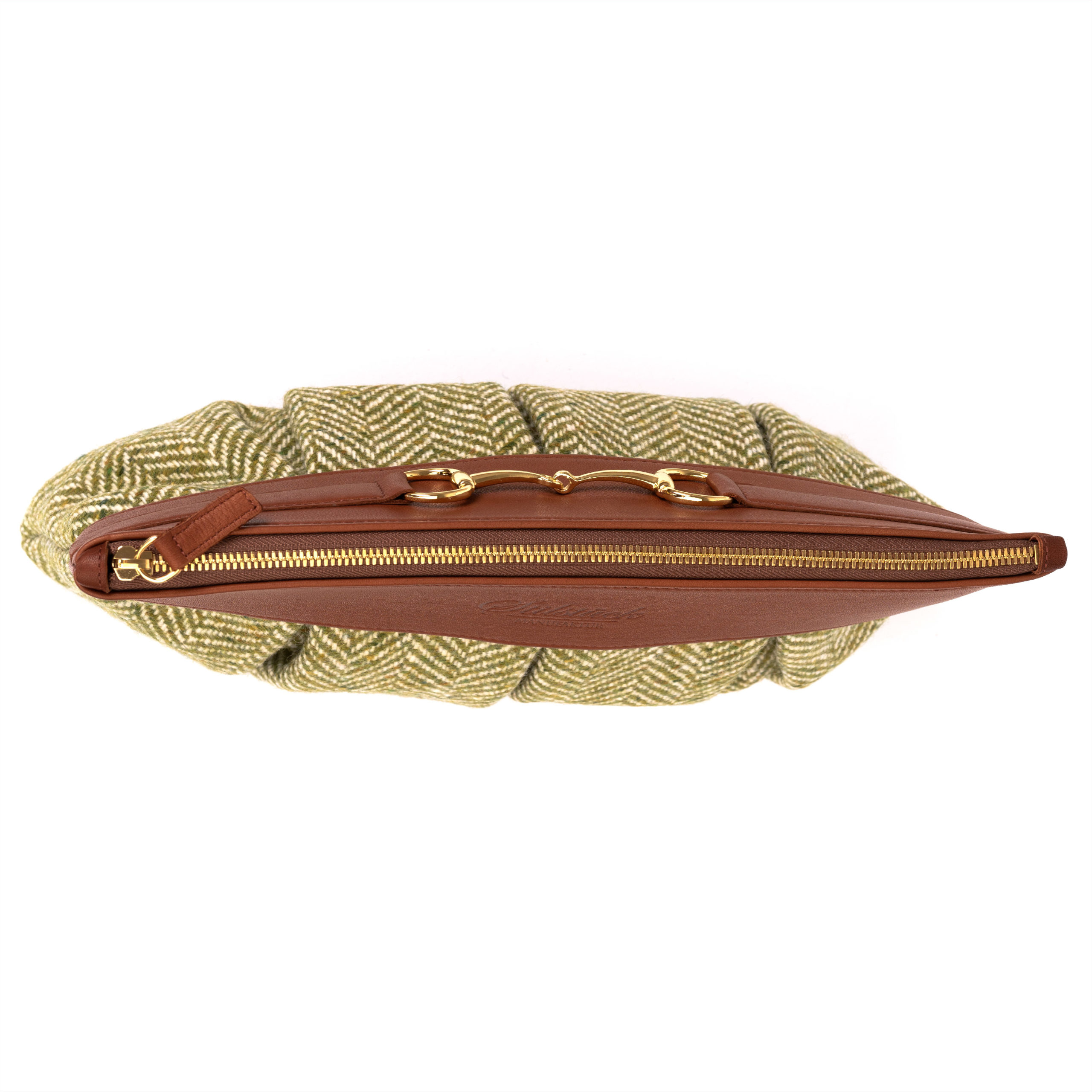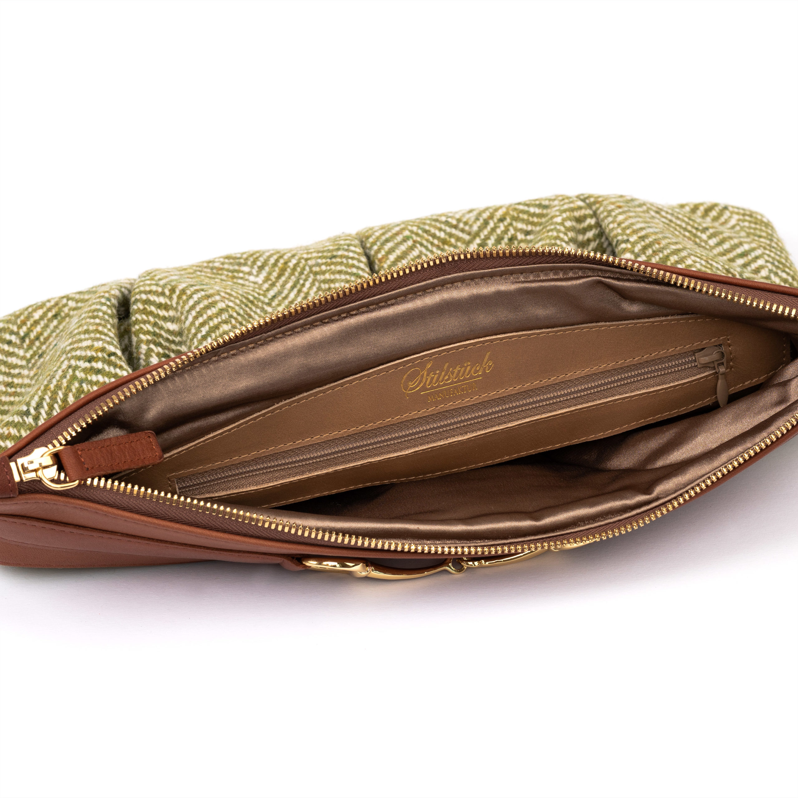 Equana besteht aus moosgrün/cremefarbenem, robustem, sehr hochwertigem, englischem Tweed aus 100 % Wolle, gewebt in England. Am oberen Rand ist Equana abgesetzt mit edlem Rindleder in einem warmen Cognacton. Als Hommage an alle Pferdeliebhaber und besonderes Highlight ist eine goldene Trense eingearbeitet. Innen ist Equana ausgestattet mit edel wattiertem, glänzendem beiges Satininnenfutter und einem Reißverschlussfach für Dinge, die schnell griffbereit sein sollen. Zu verschließen mit einem goldenen hochwertigen YKK Reißverschluss.