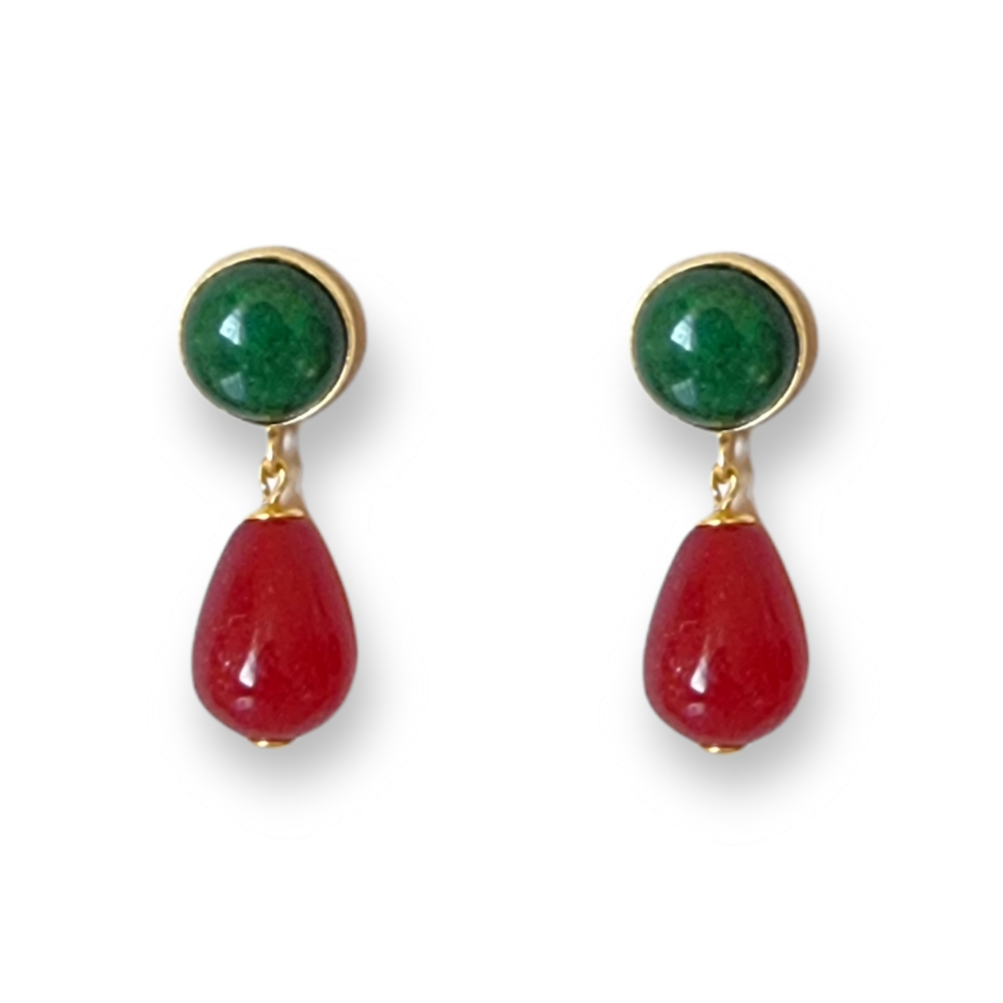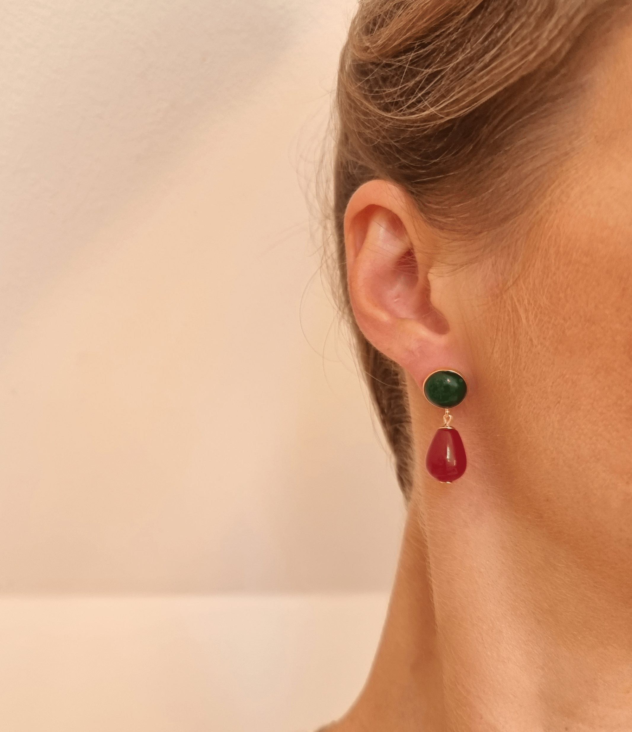 Die Ohrringe “Philippa” sind tolle Stecker-Ohrringe aus hochwertig vergoldetem 925-Silber, mit jeweils einem Stecker aus grüner Jade und rubinrotem Jade-Tropfen. Sie haben eine Gesamtlänge von etwa 30mm, sind somit bequem zu tragen und stören nicht unnötig. Zudem kann man sie in reinem Silber, also ohne Vergoldung, oder aber auch als Clips kaufen. Geliefert werden Sie in einem hochwertigen Geschenketui.