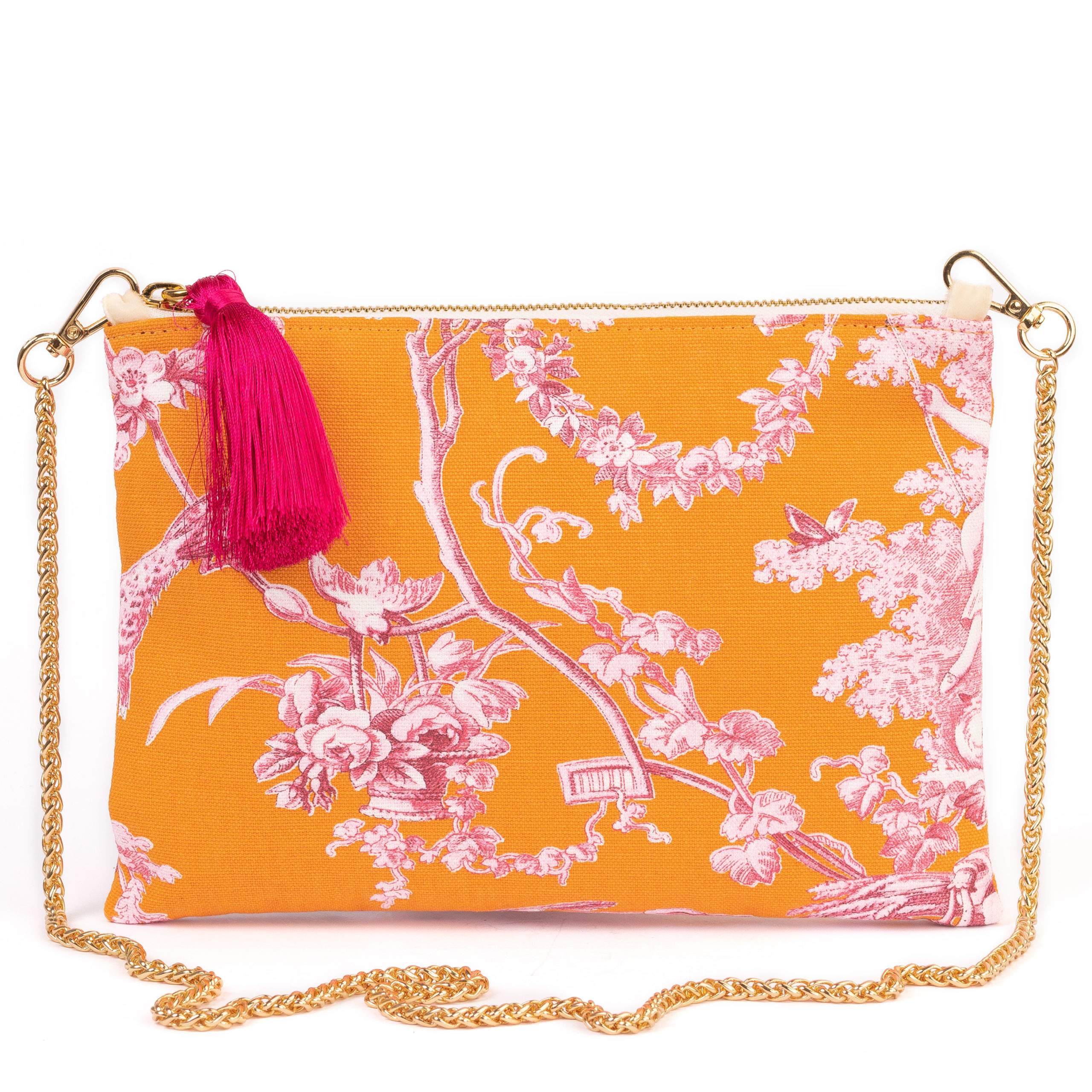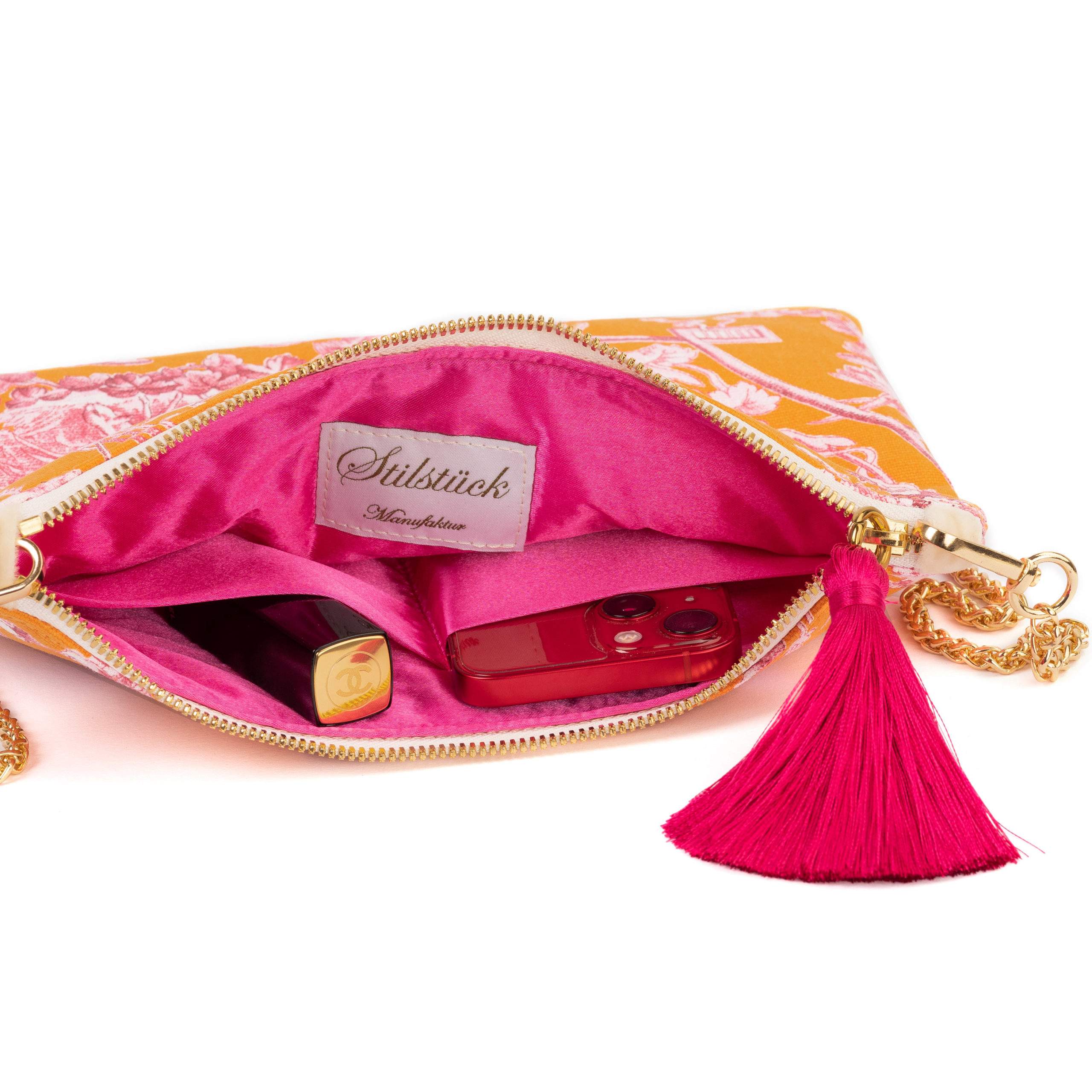 Pochette aus Toile de Jouy Stoff mit orange/pinken herrlich ländlichen Motiven und einer pinken Seidenquaste am Reißverschluss.